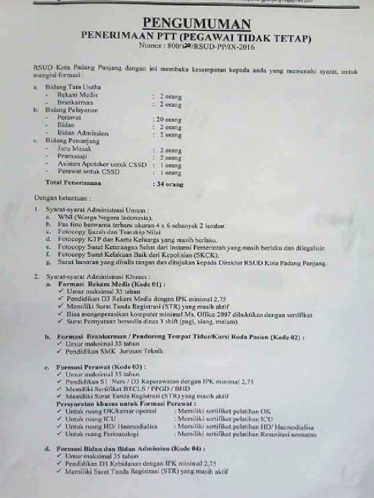 Lowongan Kerja Ptt Pegawai Tidak Tetap Rsud Kota Padang Panjang